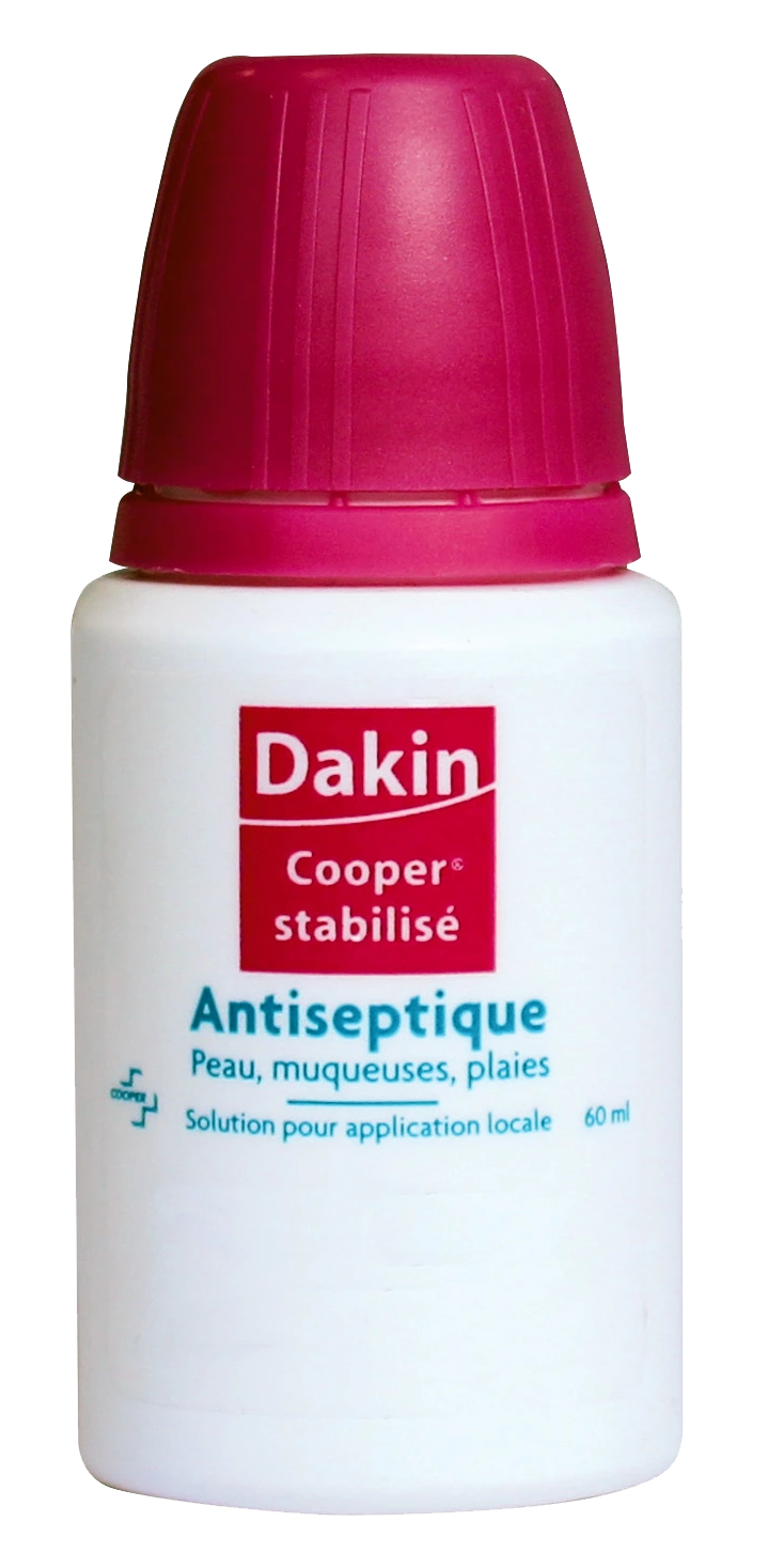 Le Dakin est un antiseptique qui se présente sous la forme d’une solution aqueuse.